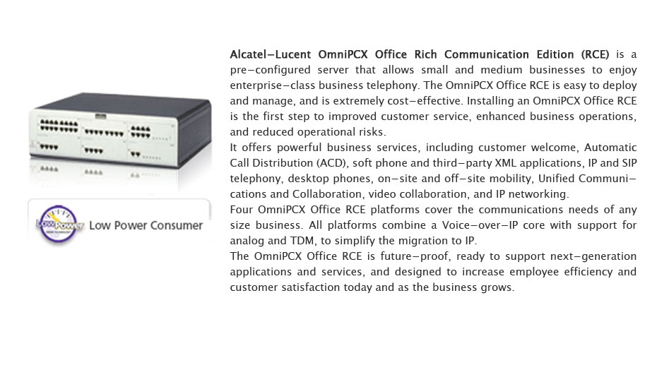 Alcatel-Lucent OmniPCX Office Rich Communication Edition (RCE) is a pre-configured server that allows small and medium businesses to enjoy enterprise-class business telephony. The OmniPCX Office RCE is easy to deploy and manage, and is extremely cost-effective.