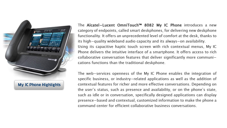 The Alcatel-Lucent OmniTouchâ„¢ 8082 My IC Phone introduces a new category of endpoints, called smart deskphones, for delivering new deskphone functionality.