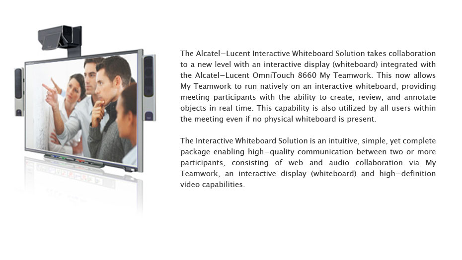 The Alcatel-Lucent Interactive Whiteboard Solution takes collaboration to a new level with an interactive display (whiteboard) integrated with the Alcatel-Lucent OmniTouch 8660 My Teamwork.