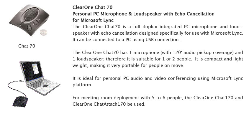 The ClearOne Chat70 is a full duplex integrated PC microphone and loudspeaker with echo cancellation designed specifically for use with Microsoft Lync. It can be connected to a PC using USB connection.