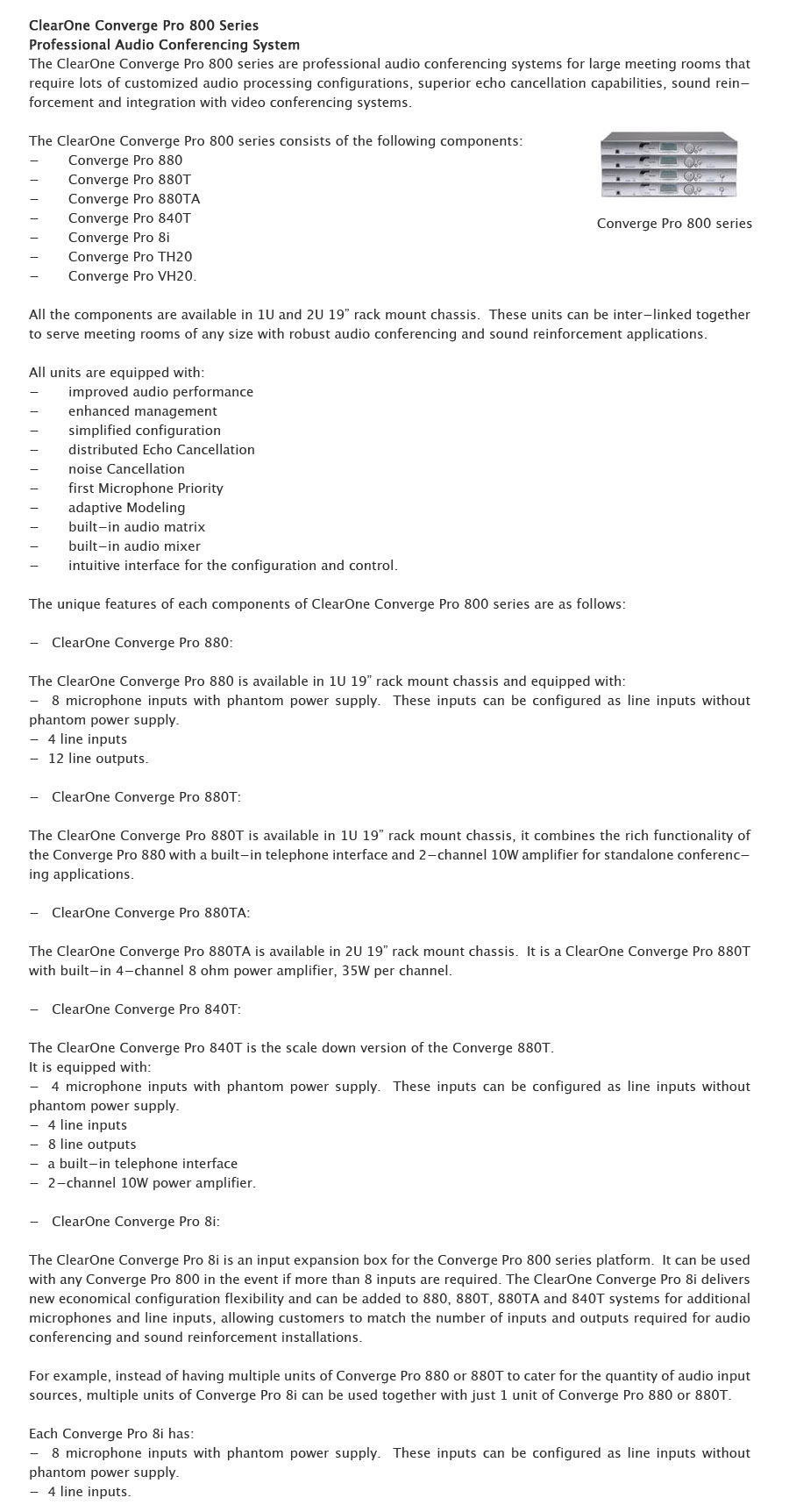The ClearOne Converge Pro 800 series are professional audio conferencing systems for large meeting rooms that require lots of customized audio processing configurations, superior echo cancellation capabilities, sound reinforcement and integration with video conferencing systems.