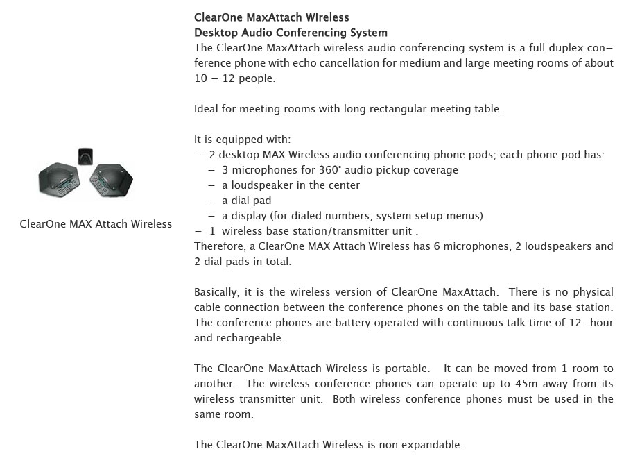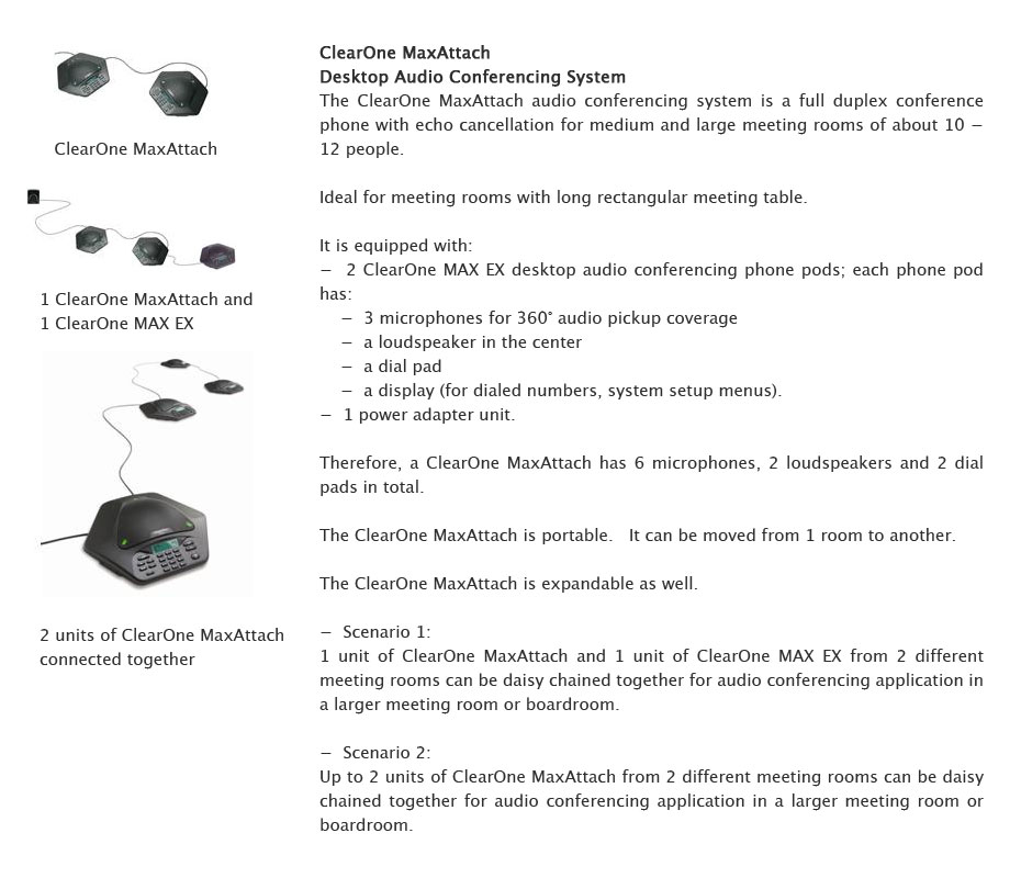 The ClearOne MaxAttach audio conferencing system is a full duplex conference phone with echo cancellation for medium and large meeting rooms of about 10 – 12 people. Ideal for meeting rooms with long rectangular meeting table.