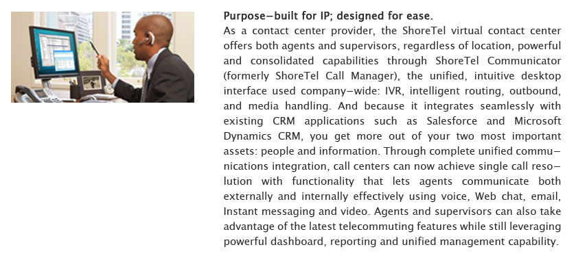 As a contact center provider, the ShoreTel virtual contact center offers both agents and supervisors, regardless of location, powerful and consolidated capabilities through ShoreTel Communicator (formerly ShoreTel Call Manager), the unified, intuitive desktop interface used company-wide: IVR, intelligent routing, outbound, and media handling.