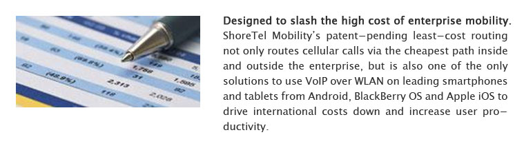 ShoreTel Mobility’s patent-pending least-cost routing not only routes cellular calls via the cheapest path inside and outside the enterprise, but is also one of the only solutions to use VoIP over WLAN