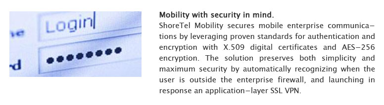 ShoreTel Mobility secures mobile enterprise communications by leveraging proven standards for authentication and encryption with X.509 digital certificates and AES-256 encryption.