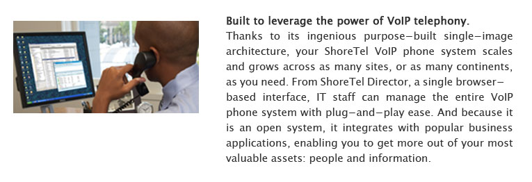 ShoreTel’s unique purpose-built distributed voice architecture forms the heart of our unified communications platform, allowing for its rich feature set and highly reliable distributed voice services. Along with IP telephony, contact center, and unified communications services, it scales with plug-and play ease across as many sites as needed.