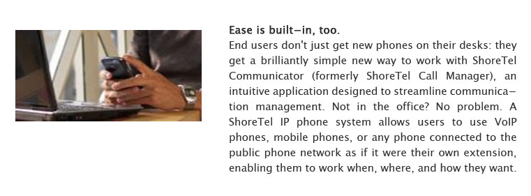 By integrating communication tasks –such as video conferencing, IM, mobility and online collaboration – usually performed with separate tools, ShoreTel’s brilliantly simple business VoIP solutions help boost productivity and reduce costs.