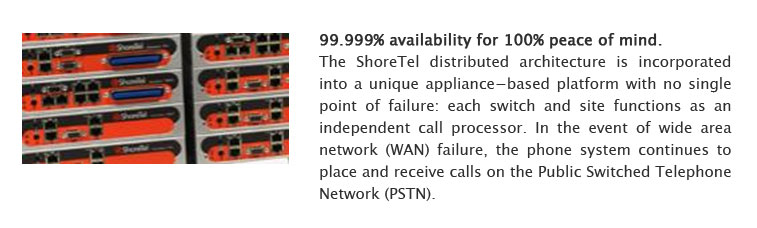 The ShoreTel distributed architecture is incorporated into a unique appliance-based platform with no single point of failure: each switch and site functions as an independent call processor.