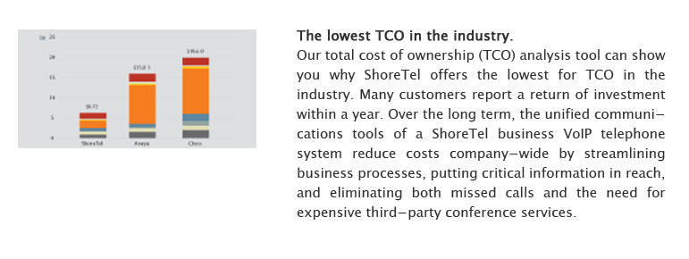 Our total cost of ownership (TCO) analysis tool can show you why ShoreTel offers the lowest for TCO in the industry. Many customers report a return of investment within a year.