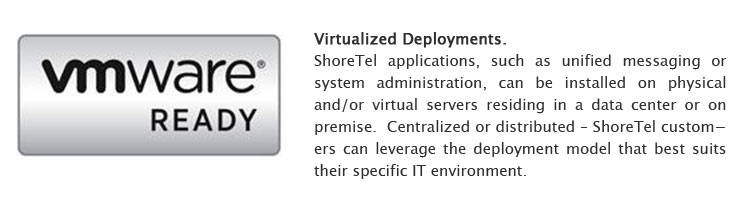 ShoreTel applications, such as unified messaging or system administration, can be installed on physical and/or virtual servers residing in a data center or on premise.